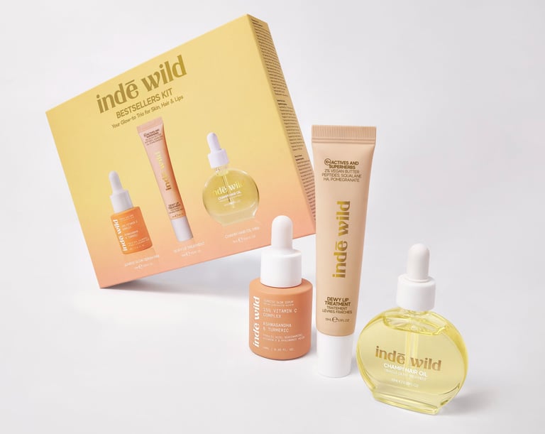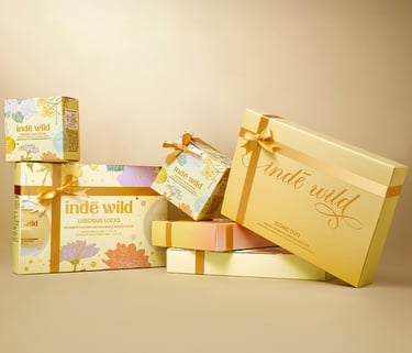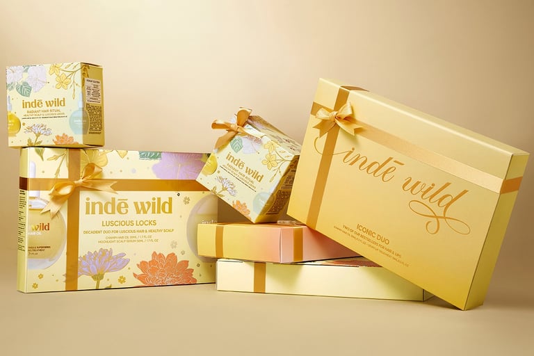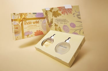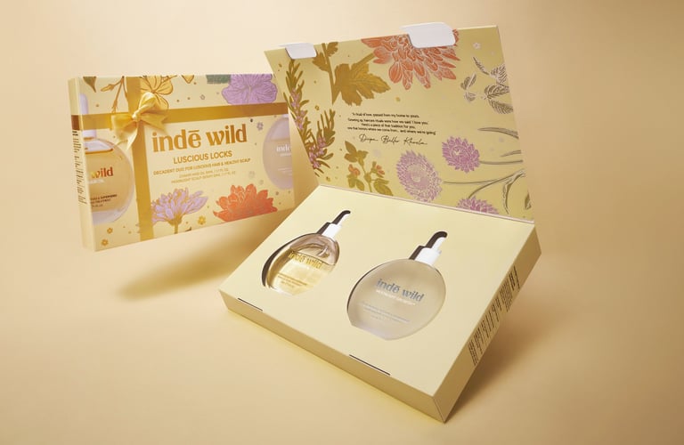 The Luscious Locks and Radiant Rituals duos are matching in their illustrative design as they contain different sizes of indē wild's flagship products: the Champi Hair Oil and the Moonlight Growth Serum.