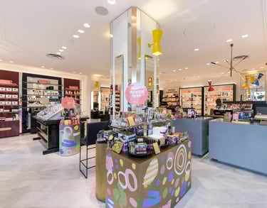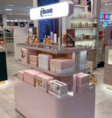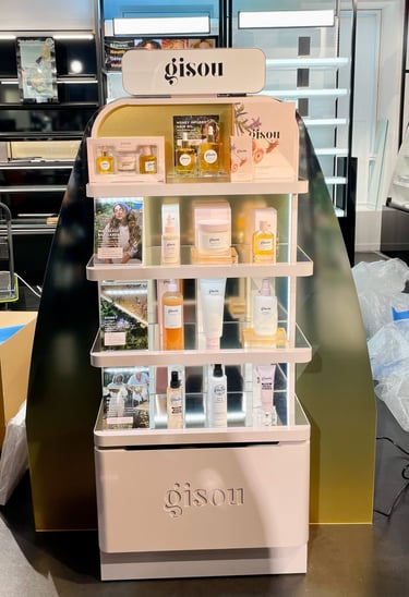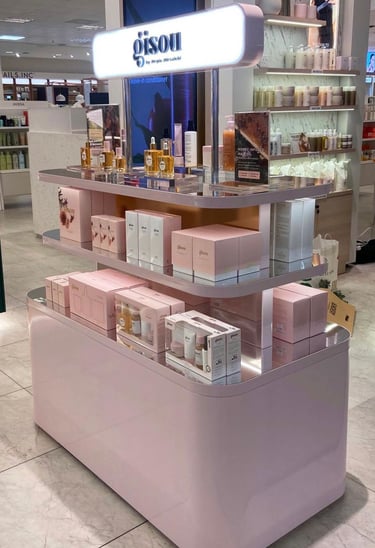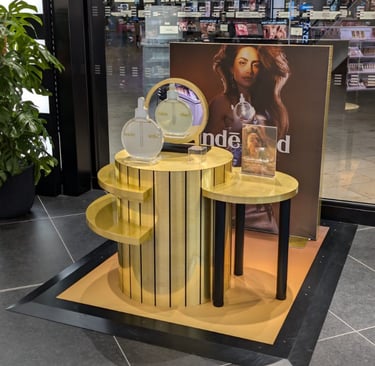 The result: Using their iconic blush pink brand colour, I designed fixtures with glossy finishes and included their signature golden gradient. The mirrored shelf bases add visual depth and showcase the product formulations.
